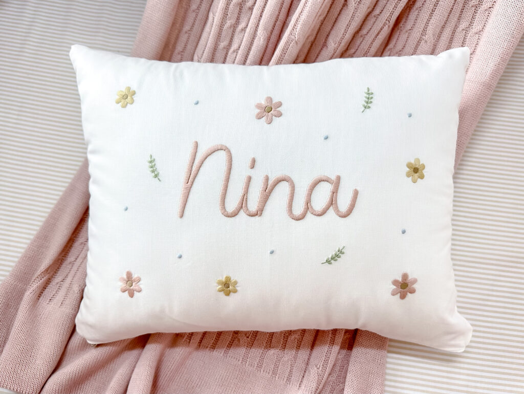 Almofada decorativa 35×45 cm com bordado personalizado. Prazo de produção 20 dias.